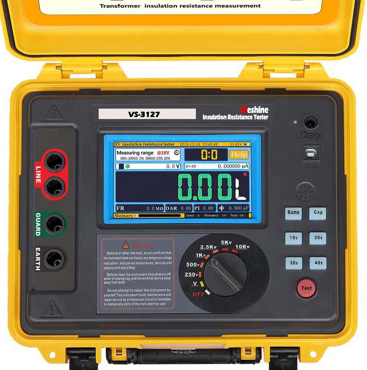 VS-3127 VS-3127Transformer ၏ Polarization အညွှန်းအမြင့်ဆုံးခုခံနိုင်မှု 30 TΩ ဖြင့် 15 kV စမ်းသပ်ဗို့အားအထိ တိကျသော insulation resistance တိုင်းတာမှုများကို လုပ်ဆောင်နိုင်စွမ်းကို ပေးဆောင်သည်။ ခံနိုင်ရည်တိုင်းတာမှုတိကျမှုသည် ± 5% သည် 1 MΩ မှ 3 TΩ အထိဖြစ်သည်။ အသုံးအဆောင်များနှင့် ဝန်ဆောင်မှုကုမ္ပဏီများအတွက် VS-3127 သည် ၎င်း၏ပြောင်းလွယ်ပြင်လွယ်နှင့် အနာဂတ်သက်သေပြနိုင်စွမ်းရှိသည့် အလုံးစုံစမ်းသပ်သူဖြစ်သည်။ Weshine VS-3127 သည် မည်သည့်နေရာတွင်မဆို အလုပ်လုပ်ရန် ဒီဇိုင်းထုတ်ထားသည်။ အထွက်အဆင့်သတ်မှတ်ထားသော ဗို့အားအမြင့်ဆုံး ဂီယာ 7 ခု (250V၊ 500V၊ 1KV၊ 2.5KV၊ 5KV၊ 10KV၊ 15KV)။ အများဆုံး short circuit လျှပ်စီးကြောင်း 7mA လျှပ်ကာခံနိုင်ရည်စမ်းသပ်မှု (IR)၊ polarization အညွှန်းကိန်းစမ်းသပ်မှု (PI)၊ dielectric စုပ်ယူမှုအချိုးစမ်းသပ်မှု (DAR)။ ချဉ်းကပ်စမ်းသပ်မုဒ် (RAMP)၊ စစ်ထုတ်ထားသော ခုခံမှုစမ်းသပ်မုဒ် (FR)။ * Capacitance Test (Cap.) ဗို့အားမော်နီတာလုပ်ဆောင်ချက်၊ တိုင်းတာသည့် တိုက်ရိုက်ဗို့အားကို အလိုအလျောက် စောင့်ကြည့်သည်။